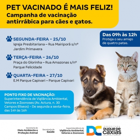 A Prefeitura de Duque de Caxias segue com a Campanha de Vacinação Antirrábica para cães e gatos no município. Nos dias 25, 26 e 27 de outubro serão contemplados os bairros Parque Capivari, Parque Felicidade e Jardim Primavera..