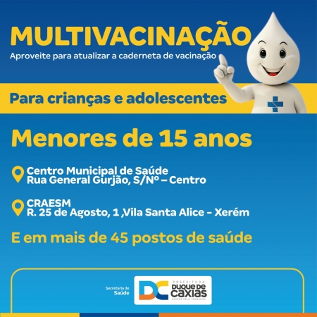 A Prefeitura de Duque de Caxias, através da Secretaria Municipal de Saúde, realizará o DIA D da Multivacinação no dia 16/10 (sábado), em 49 postos da cidade, das 8h às 17h. O objetivo é atualizar a caderneta de vacinação de crianças e adolescentes menores de 15 anos de idade. Nessa data, todos os esforços serão concentrados na busca da conscientização da importância do ato. .