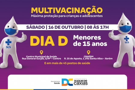 A Prefeitura de Duque de Caxias, através da Secretaria Municipal de Saúde, realizará o DIA D da Multivacinação, no dia 16/10 (sábado), em 49 postos da cidade, das 8h às 17h. O objetivo é atualizar a caderneta de vacinação de crianças e adolescentes menores de 15 anos de idade. Nessa data, todos os esforços serão concentrados na busca da conscientização da importância do ato. .