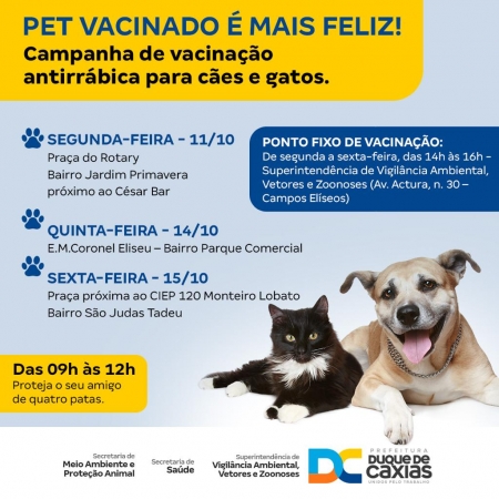 A Prefeitura de Duque de Caxias segue com a Campanha de Vacinação Antirrábica para cães e gatos no município. Nos dias 11, 14 e 15 de outubro serão contemplados os bairros Jardim Primavera, Parque Comercial e São Judas Tadeu..