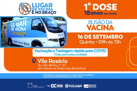 A Secretaria Municipal de Saúde de Duque de Caxias, em parceria com a Fiocruz – Fundação Instituto Osvaldo Cruz, promove nesta quinta-feira (16/09) uma ação de saúde voltada prioritariamente para os moradores da Vila Rosário, no segundo distrito. A atividade, que será realizada das 9h às 13h, na Av. São Bento, n° 20 (em frente ao Posto dos Bichinhos), contará com a presença do ‘Busão da Vacina’, a unidade móvel da Secretaria Municipal de Saúde, disponibilizando a vacinação contra a Covid-19 para pessoas com idade a partir de 18 anos..