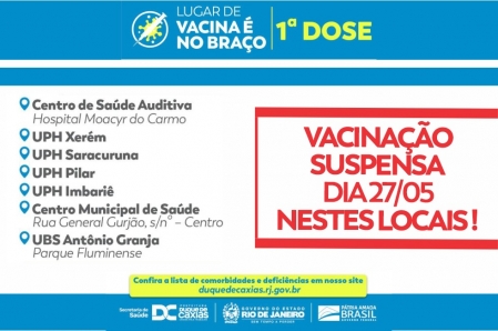 A Prefeitura de Duque de Caxias, através da Secretaria Municipal de Saúde, informa que suspendeu a vacinação da primeira dose da vacina Pfizer marcada para quinta-feira (27/05). A administração municipal aguarda a chegada de novas remessas para que seja retomada a aplicação do imunizante. A prefeitura ressalta que a aplicação da segunda dose da vacina Astrazeneca para quem tomou a primeira dose no dia 18 de março seguirá normalmente nos seguintes locais, a partir das 7h: - Praça Dr. Laureano (em frente ao Hospital do Olho) - Praça do Cruzeiro (Vila Operária) - Restaurante do Povo..