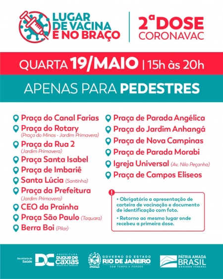 A Prefeitura de Duque de Caxias convoca a todos que aguardam a segunda dose da vacina Coronavac para um mutirão de vacinação que acontece nesta quarta-feira (19/05), a partir das 15 horas, em 16 pontos montados no município. .