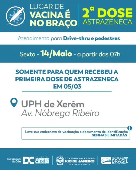 A Prefeitura de Duque de Caxias segue nesta sexta-feira (14/05) com a vacinação de primeira dose de Astrazeneca em quatro pontos de vacinação tendo como público-alvo deficientes permanentes e pessoas com comorbidades, com idade acima de 45 anos. Além disso, haverá a aplicação da segunda dose da vacina Astrazeneca para quem tomou a primeira dose no dia 5 de março. .