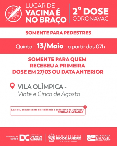 A Prefeitura de Duque de Caxias segue com a vacinação de segunda dose da Coronavac, neste sábado (15/05), a partir das 7 horas, para os idosos que receberam a primeira dose nos dias 28 e 29/03. A aplicação da segunda dose da vacina Coronavac para quem recebeu a primeira dose em 28/03, acontece na Praça do Samucão (Parque Paulista), Praça do Parque Eldorado e Praça da Codora (Santa Cruz da Serra). Para aqueles que receberam em 29/03, a vacinação acontece na Vila Olímpica (Vinte e Cinco de Agosto). .