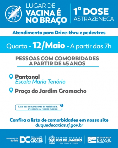 A vacinação contra a Covid-19 segue nesta quarta-feira (12/05) no município de Duque de Caxias. Poderão receber a primeira dose da vacina Astrazeneca pessoas que tenham comorbidades, com idade acima de 45 anos, mediante a apresentação de atestado ou receita médica que comprove a comorbidade, documento de identificação e comprovante de residência. Confira ao final do texto a lista de comorbidades que podem receber a vacina. .