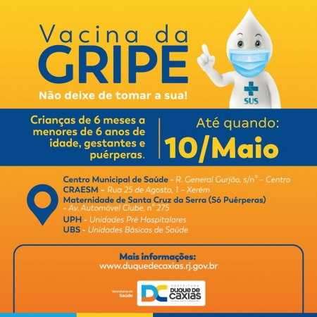 A Prefeitura de Duque de Caxias, através da Secretaria Municipal de Saúde, segue com a vacinação contra a Gripe Influenza para os grupos prioritários desta primeira etapa, segundo determinação do Ministério da Saúde. A primeira etapa da vacinação na cidade irá até o dia 10/05, contemplando crianças de 6 meses a menores de 6 anos de idade, gestantes e puérperas (Mulheres que tiveram bebê nos últimos 45 dias). Os profissionais de saúde também estão sendo imunizados contra a gripe nesta primeira etapa..