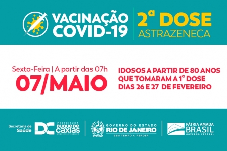 A Prefeitura de Duque de Caxias aplica, nesta sexta-feira (07/05), a partir das 7h, a segunda dose da vacina Astrazeneca para os idosos a partir de 80 anos que tomaram a primeira dose nos dias 26 e 27 de fevereiro. A Secretaria Municipal de Saúde orienta para que todos levem comprovante de residência, documento de identificação e o comprovante de vacinação. .