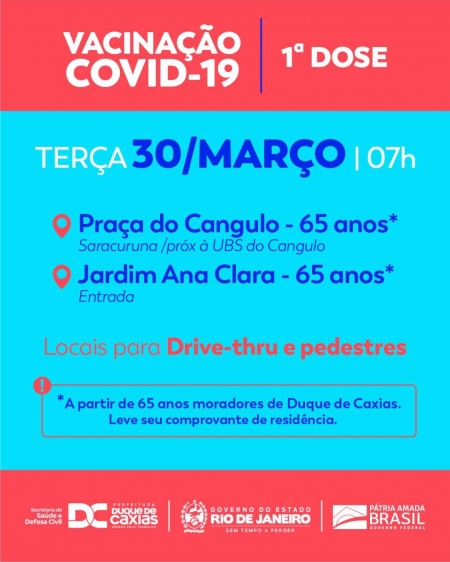 Nesta terça-feira (30/03), a Prefeitura de Duque de Caxias segue com a vacinação da primeira dose da vacina contra a Covid-19 para pessoas de 65 anos ou mais no município. A vacinação acontece, a partir das 7 horas, nos bairros Cangulo e Jardim Ana Clara. A Prefeitura ressalta que é preciso apresentar comprovante de residência e documento de identidade no ato da vacinação..