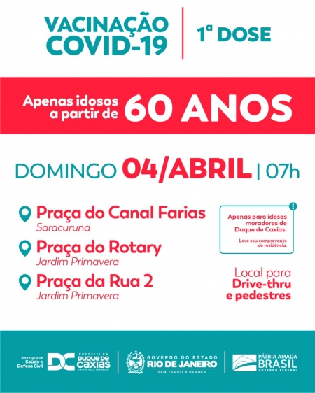 A Prefeitura de Duque de Caxias promove neste domingo (04/04), a partir das 7 horas, aplicação da primeira dose da vacina contra a Covid-19 para pessoas de 60 anos ou mais no município. A Prefeitura ressalta que é preciso apresentar comprovante de residência e documento de identidade no ato da vacinação..