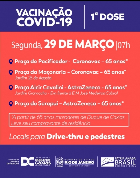 Nesta segunda-feira (29/03), a Prefeitura de Duque de Caxias segue com a vacinação da primeira dose da vacina contra a Covid-19 para pessoas de 65 anos ou mais no município. A vacinação acontece a partir das 7 horas e a Prefeitura ressalta que é preciso apresentar comprovante de residência e documento de identidade no ato da vacinação..