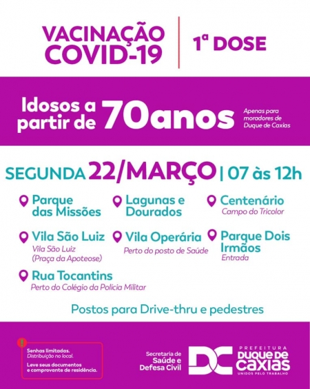 A Prefeitura de Duque de Caxias segue, nesta terça-feira (23/03), a partir das 7 horas, com a aplicação da primeira dose da vacina contra a Covid-19 para pessoas de 70 anos ou mais no município. A Prefeitura ressalta que é preciso apresentar comprovante de residência e documento de identidade no ato da vacinação..