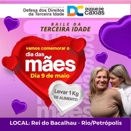 Para celebrar o Dias das Mães, a Prefeitura de Duque de Caxias, através da Secretaria Municipal de Defesa dos Direitos da Terceira Idade, irá promover o baile da terceira idade. A data, que celebra o amor de mãe ao longo dos últimos séculos, será festejada em grande estilo..