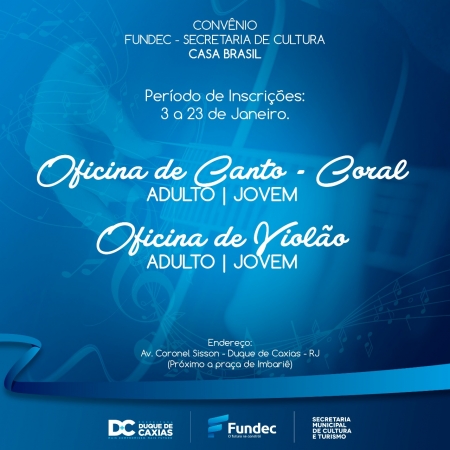 Prosseguem as inscrições para as oficinas de Canto-Coral e Violão da FUNDEC até o dia 23/01. Os cursos serão ministrados na Casa Brasil, em Imbariê, e os interessados que desejarem concorrer a uma das vagas deverão ter no mínimo nove anos, ser alfabetizados ou possuir o Ensino Fundamental completo ou em andamento. .