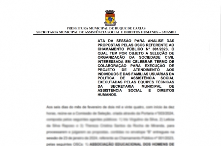 A SECRETARIA MUNICIPAL DE ASSISTÊNCIA SOCIAL E DIREITOS HUMANOS DE DUQUE DE CAXIAS – RJ, com esteio na Lei nº 13.019, de 31 de julho de 2014, Deliberação 277/2017 do Tribunal de Contas do Estado do Rio de Janeiro – TCE-RJ, torna público o resultado preliminar do chamamento público nº 001/2023, tendo sido classificadas e habilitadas as seguintes OSCs: 1) OBRA DE RECUPERAÇÃO E ASSISTENCIA SOCIAL GETSEMANI, inscrita no CNPJ sob o nº 36.066.967/0001-13, 2) ASSOCIAÇÃO EDUCACIONAL DOS HOMENS DE AMANHÃ – CASA DE ABRIGO BETEL, inscrita no CNPJ sob o nº 00.761.702/0001-98 e 3) CENTRO INTEGRADO DE REABILITAÇÃO SARAPUI, inscrito no CNPJ sob o n° 01.740.278/0001-68, as demais instituições que apresentaram propostas na sessão realizada no dia 23/01/2024 estão desclassificadas. E, em cumprimento ao Edital, os participantes que desejarem interpor recurso contra o resultado preliminar, deverão apresentar recurso administrativo, no prazo de 5 (cinco) dias úteis, contados a partir do primeiro dia útil seguinte à divulgação do resultado preliminar. Os referidos recursos devem ser apresentados por meio físico para a Comissão de Seleção, conforme previsto no item 7.7.2 do Edital. .
