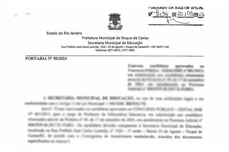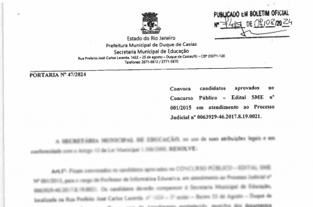 A Prefeitura de Duque de Caxias convoca os novos servidores que preencherão cargos na Secretaria Municipal de Educação para o cargo de professor de Informática Educativa. Os candidatos deverão comparecer à sede da Secretaria Municipal de Educação, situada à Rua Prefeito José Carlos Lacerda, nº 1424, Jardim 25 de Agosto, 3º andar, de acordo com o cronograma de atendimento estabelecido na portaria, bem como munidos dos documentos especificados no Anexo I..