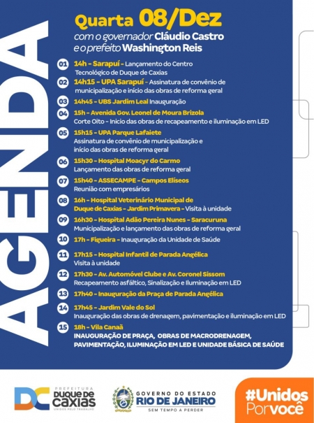 O governador Cláudio Castro e o prefeito de Duque de Caxias, Washington Reis, participarão de uma agenda com uma série de compromissos na próxima quarta-feira (08/12), a partir das 14h, na cidade da Baixada Fluminense. Entre eles, destaque para a municipalização de unidades de saúde, lançamento e inauguração de várias obras..