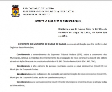 O prefeito de Duque de Caxias, Washington Reis, publicou, nesta terça-feira (05/10), um decreto desobrigando o uso de máscara facial no território do Município de Duque de Caxias. A nova determinação leva em conta o alto número de pessoas vacinadas contra o novo coronavírus na cidade da Baixada Fluminense e os índices de casos em constante queda. .