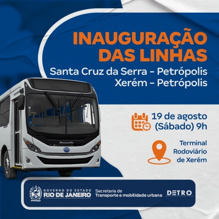 A pedido de moradores de Xerém e Santa Cruz da Serra, o Departamento de Transportes Rodoviários do Estado do Rio de Janeiro (Detro-RJ) autorizou o funcionamento de duas linhas intermunicipais, ligando esses locais ao Centro de Petrópolis. A inauguração dos novos trajetos será no próximo sábado, 19, às 9h, com a presença de autoridades no Terminal Rodoviário de Xerém. .