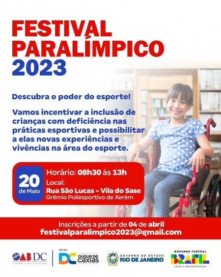A 2ª Subseção da Ordem dos Advogados do Brasil (OAB), através da Assessoria Especial da Presidência, em parceria com o Comitê Paralímpico Brasileiro e apoio da Prefeitura de Duque de Caxias, realizarão a segunda edição do Festival Paralímpico 2023, no dia 20/05, das 8h30 às 13h, no Grêmio Poliesportivo de Xerém. .