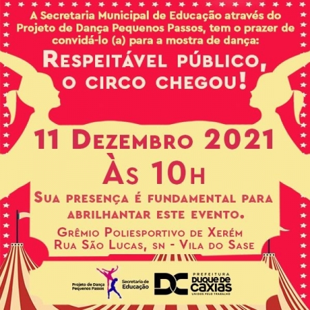 A Prefeitura de Duque de Caxias, através da Secretaria Municipal de Educação, promoverá, no dia 11/12, às 10h, no Grêmio Poliesportivo de Xerém, a Mostra de Dança – Pequenos Passos. Os alunos do projeto desenvolvido pela SME apresentarão o tema “Respeitável Público, o Circo Chegou!”..