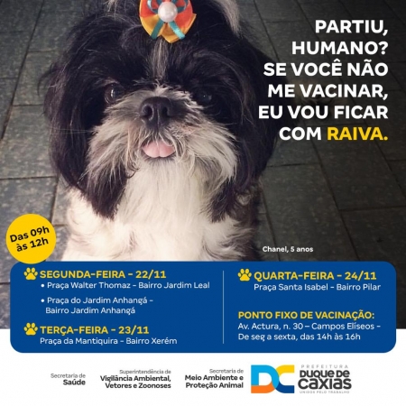 A Prefeitura de Duque de Caxias segue com a Campanha de Vacinação Antirrábica para cães e gatos no município. Esta semana as equipes de vacinação estarão nos bairros Jardim Leal, Jardim Anhangá, Pilar e Xerém, nos dias 22, 23 e 24 de novembro. .