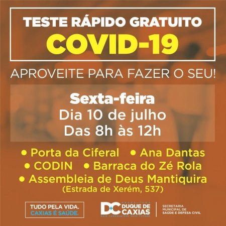 A ação de testagem rápida para a Covid-19 chega em mais bairros de Duque de Caxias nesta nesta sexta-feira (10). As equipes da Secretaria Municipal de Saúde e Defesa Civil vão atuar: Porta da Ciferal; Ana Dantas; CODIN; Barraca do Zé Rola; Assembleia de Deus Mantiquira (Estrada de Xerém, 537), das 8h ao meio-dia. .
